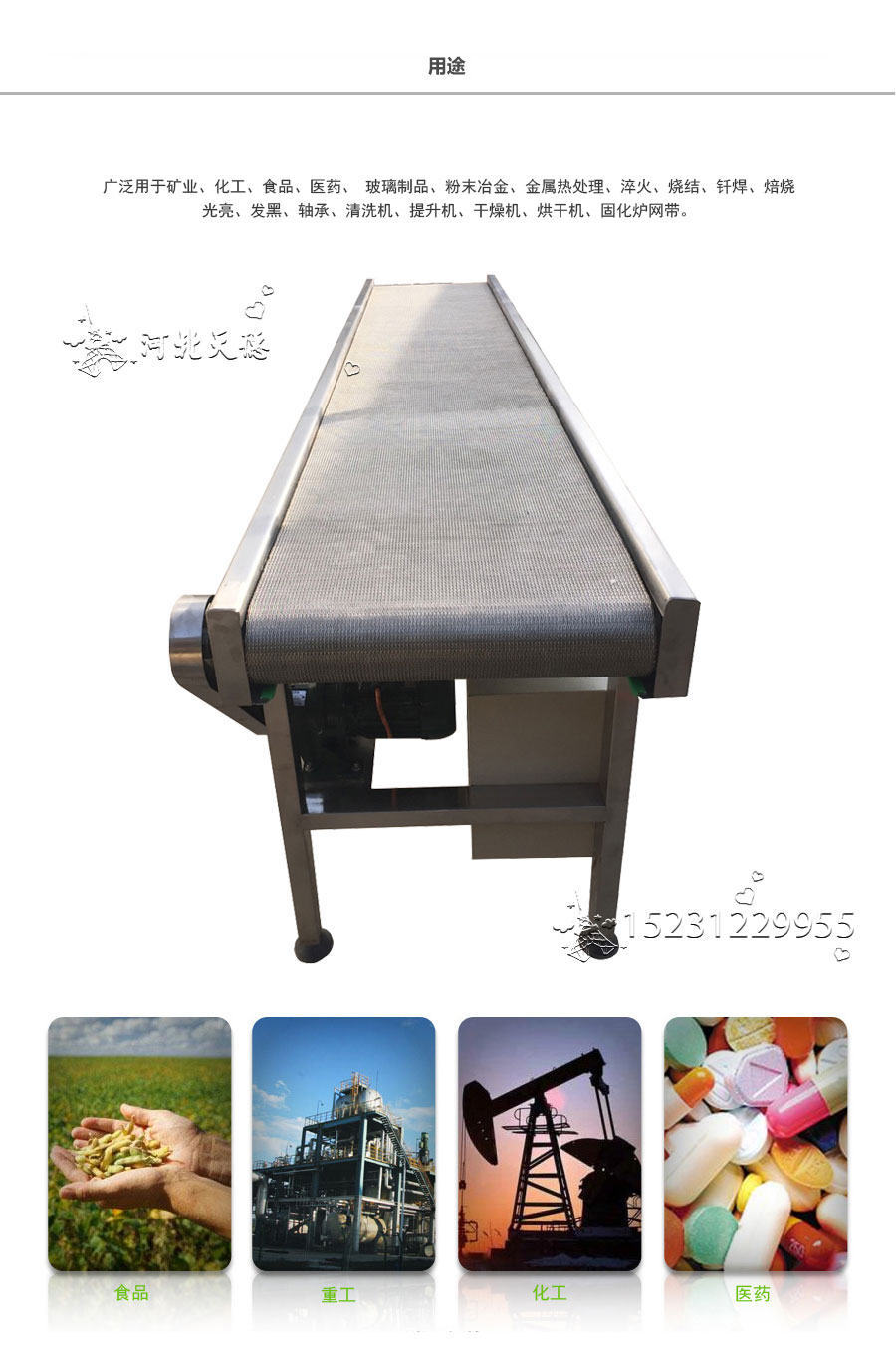 人字形網帶應用:主要應用于食品烘干機、蔬菜、海產品清洗機,巴氏機,方便面米粉蒸煮、熱收縮膜包裝機。玻璃瓶罐、食品、燈炮、金屬、器皿、化纖、印染、醫藥、電子、粉末冶金、熱處理、木材、物流輸送等各行業自動裝置和自動流水線的使用;焦爐煤氣及電子紅外線等各種窯爐系統的傳動使用等食品機械,玻璃機械,輸送機械。