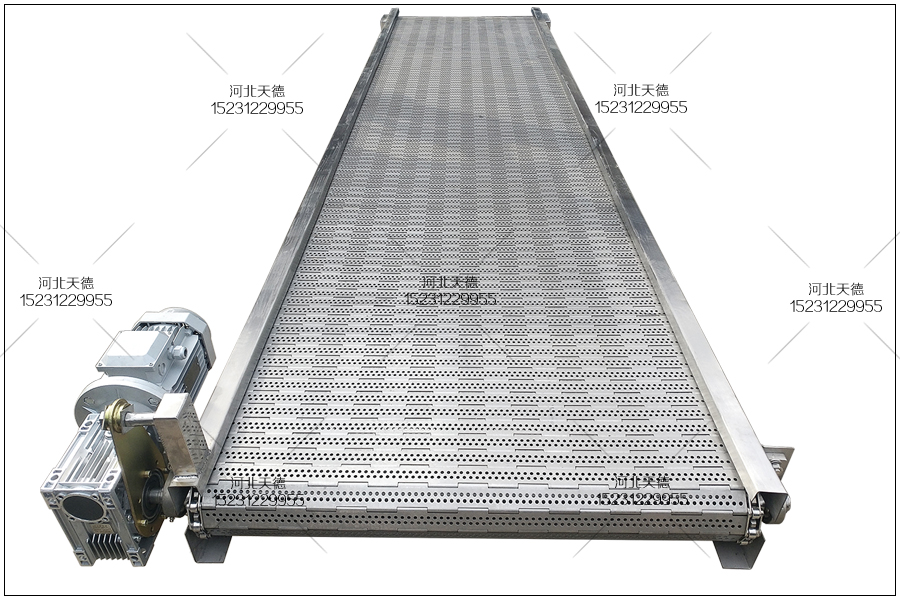 這臺鏈板不銹鋼輸送機(jī)的總長度為5米,輸送機(jī)總寬度為0.8米,沒有腿,客戶自己根據(jù)需要在焊 接機(jī)腿。采用3.0毫米厚度的鋼板折彎加工成的機(jī)身,不銹鋼鏈板輸送帶的板厚為2.0毫米,輸送鏈條節(jié)距為38.1毫米,桿直徑為8毫米,鏈板輸送帶表面打孔的直徑為3.0毫米。配套使用的鏈輪為直徑120毫米左右的。電機(jī)采用0.75千瓦電機(jī),配套使用的減速機(jī)、變頻器都會安裝好。